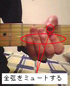 親指で6弦、人差し指の先で5弦、第2関節あたりで1弦をミュートします。