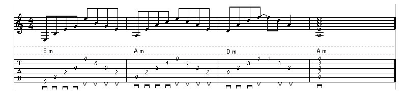 2小節目にハンマリングとプリングオフを使ったアルペジオの練習です。