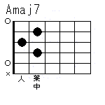 Aコードは、2弦2フレットを薬指、3弦2フレットを中指、4弦2フレットを人差し指で押さえます。